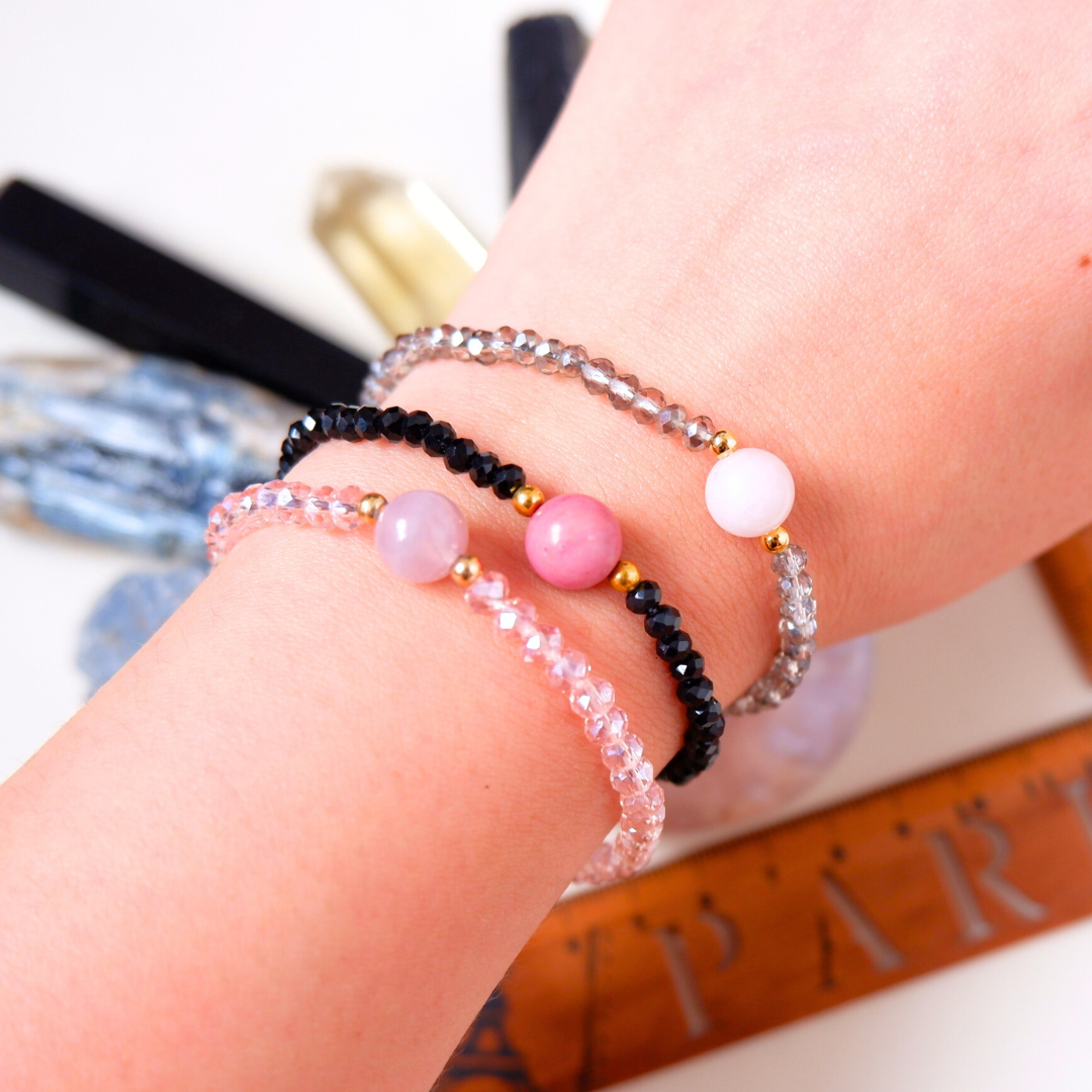 A simple but stylish bracelet made from stainless steel chain, and small gold balls that accentuate the tube crystal of your choice. The length of the bracelet is usually 6.5 inches but it can be shorter or longer depending on your request. There are 13 Crystals to choose from some are the best selling Rose Quartz, Carnelian, and many more. Now Available in Green Aventurine and Strawberry Quartz too!