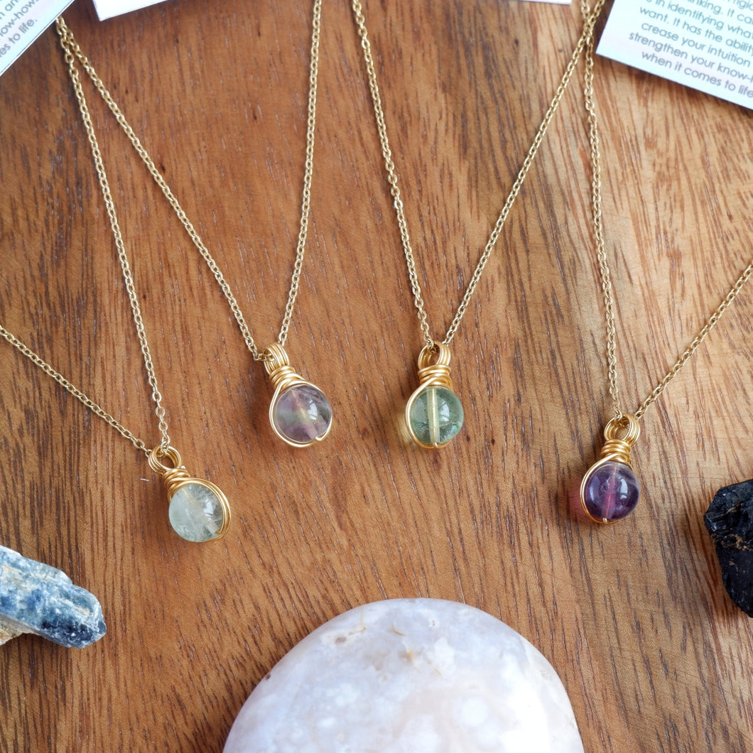 Simple, cute and dainty pendant. Perfect for a classy and effortless look! Hand-wrapped using silver or gold aluminum, the Dew Necklaces are an affordable but fashionable gift choice. From Amethyst to Unakite, you have a LOT of crystal options to choose from.
